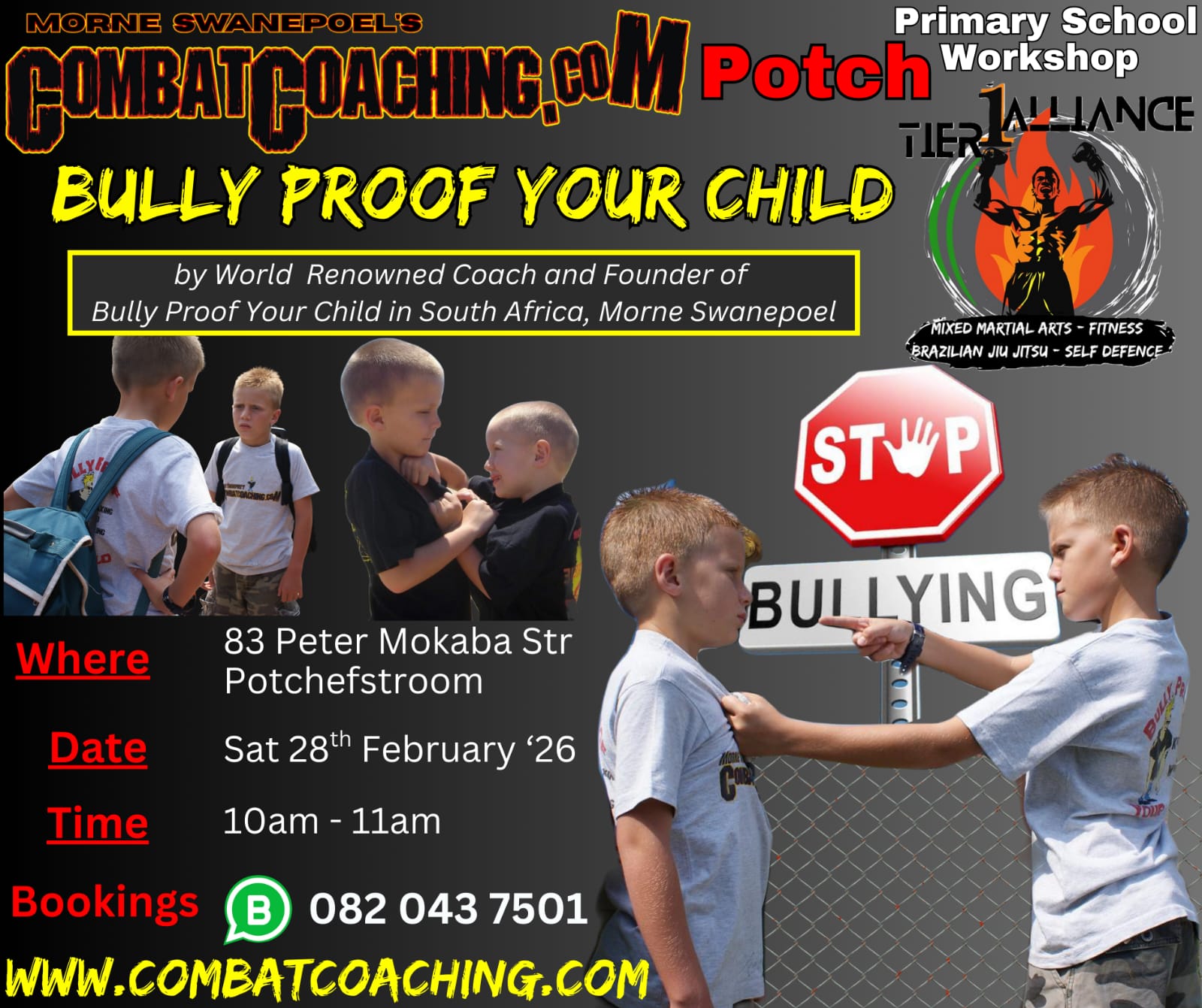 Bully Proof your Child Workshop conducted by Head Coach, Morne Swanepoel + Add to Google Calendar + iCal / Outlook export 00 days 00 hours 00 minutes 00 seconds Date Feb 28 2026 Time 10:00 am - 11:00 am Location Potchefstroom 83 Peter Mokaba Street Category Combat Coaching Organizer CombatCoaching Phone 083 226 1576 Email info@combatcoaching.com Other Organizers Morne Email morne@combatcoaching.com Share this event